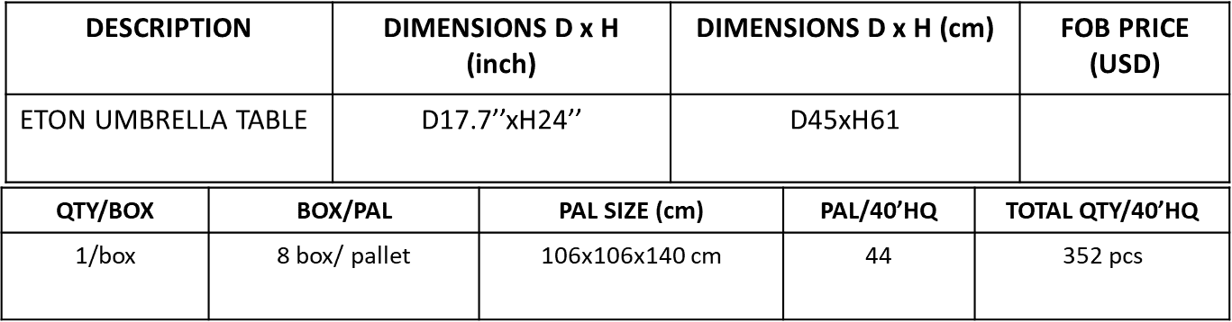 Description: The ETON Umbrella Table features a sleek, hourglass-shaped design with a smooth, rounded top and a central hole for umbrella placement. This handmade piece from Vietnam is constructed from durable materials including Magnesium Oxide (MgO), clay, and kaolin. It is designed for outdoor use, making it perfect for patios, gardens, or any outdoor setting. Available in various colors and sizes, the ETON table combines modern design with functionality.