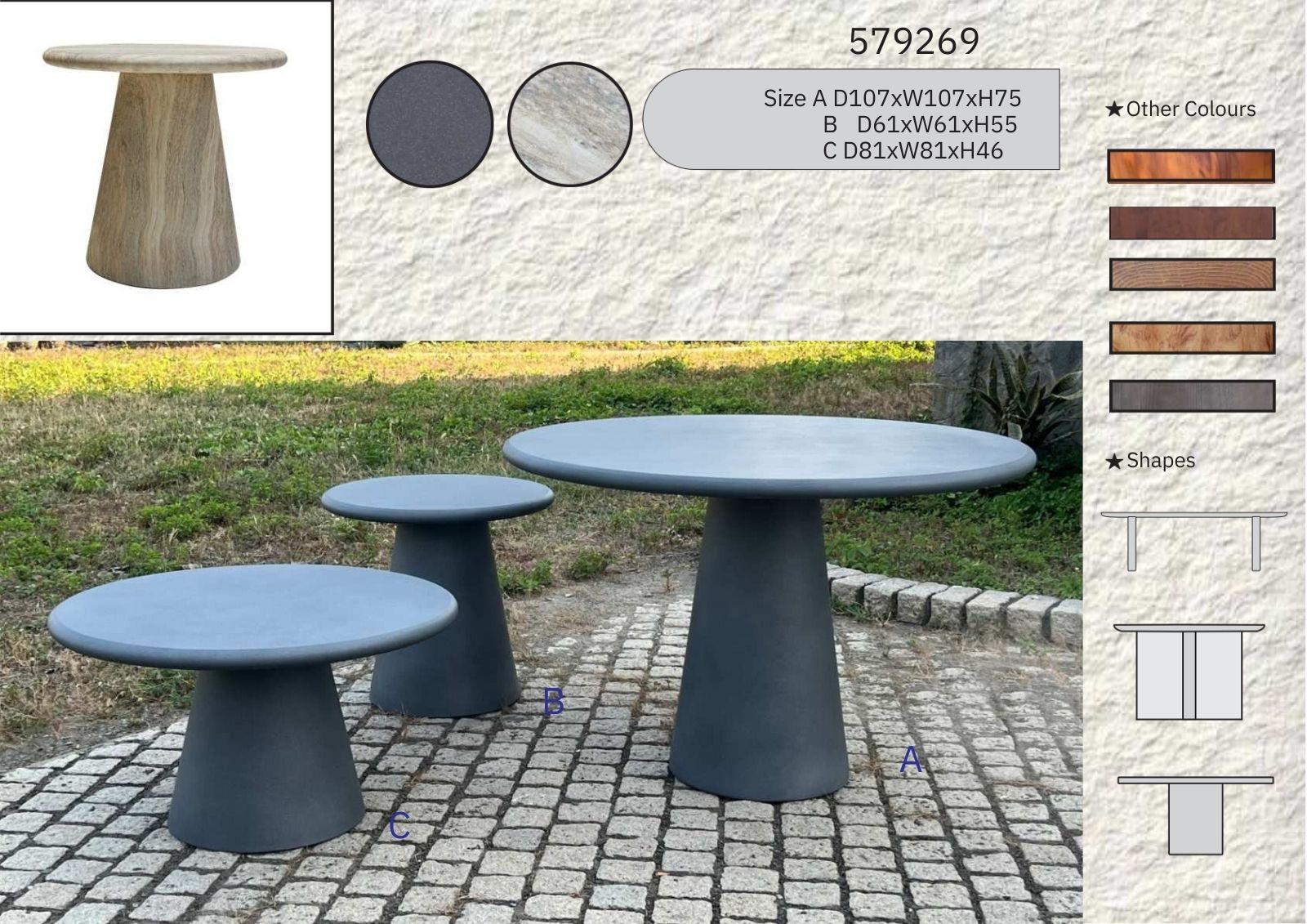 | Size | A: D107xW107xH75 cm (42.1x42.1x29.5 in) B: D61xW61xH55 cm (24.0x24.0x21.7 in) C: D81xW81xH46 cm (31.9x31.9x18.1 in) |