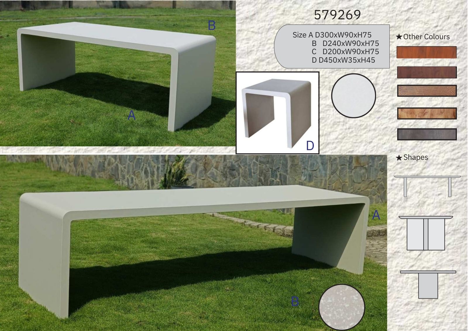| Shapes | U-shaped bench with clean, minimalist lines |